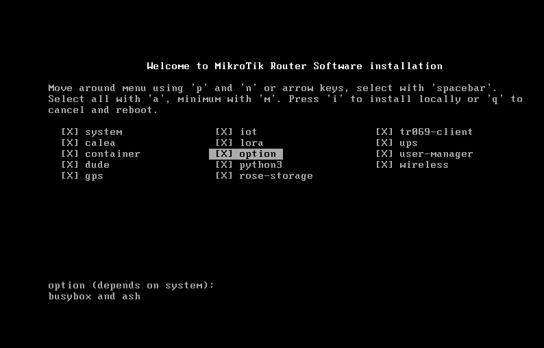 Lựa chọn các package để cài đặt: Để cài tất cả các Package thì bạn nhấn phím “a” sau đó nhấn phím “i” để cài đặt. Hoặc có thể tuỳ chọn một vài Package bằng phím “Spacebar” nhưng tối thiểu phải có system và option.