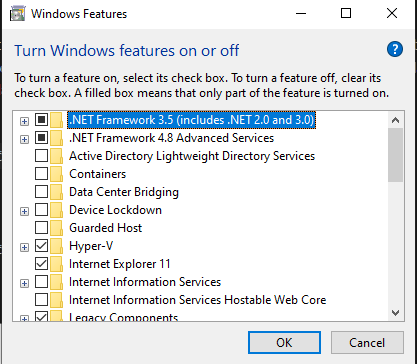 Hoặc có thể vào Windows features tìm kiếm Hyper-V chọn tích và ấn OK