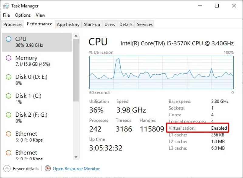 Cần ít nhất 2GB RAM, CPU của bạn phải hỗ trợ ảo hóa bằng Intel VT-x hoặc AMD-V. Để kiểm tra, nhấp chuột phải vào Thanh tác vụ và chọn Task Manager (Trình quản lý tác vụ). Mở tab Performance (Hiệu suất). Trong biểu đồ, hãy kiểm tra trạng thái Virtualization (Ảo hóa).