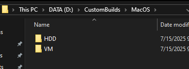 Tạo thư mục CustomBuilds -> MacOS và tạo thêm 2 thư mục là HDD và VM bên trong